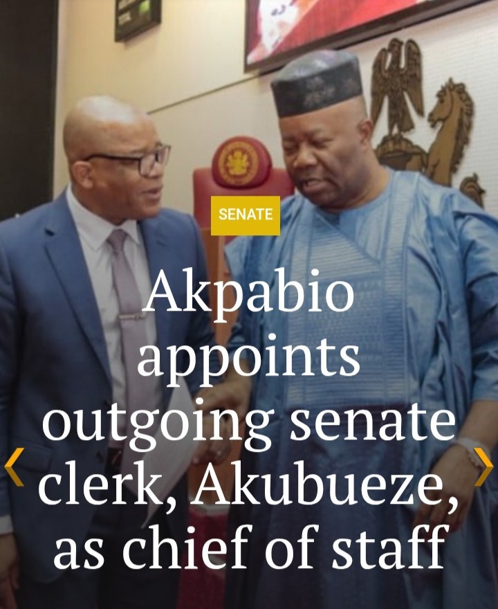 ABUJA NIGERIA – President of the Senate, Godswill Akpabio, on Wednesday, appointed the outgoing Senate Clerk, Chinedu Akabueze, as the new Chief of Staff to the President of the Senate.