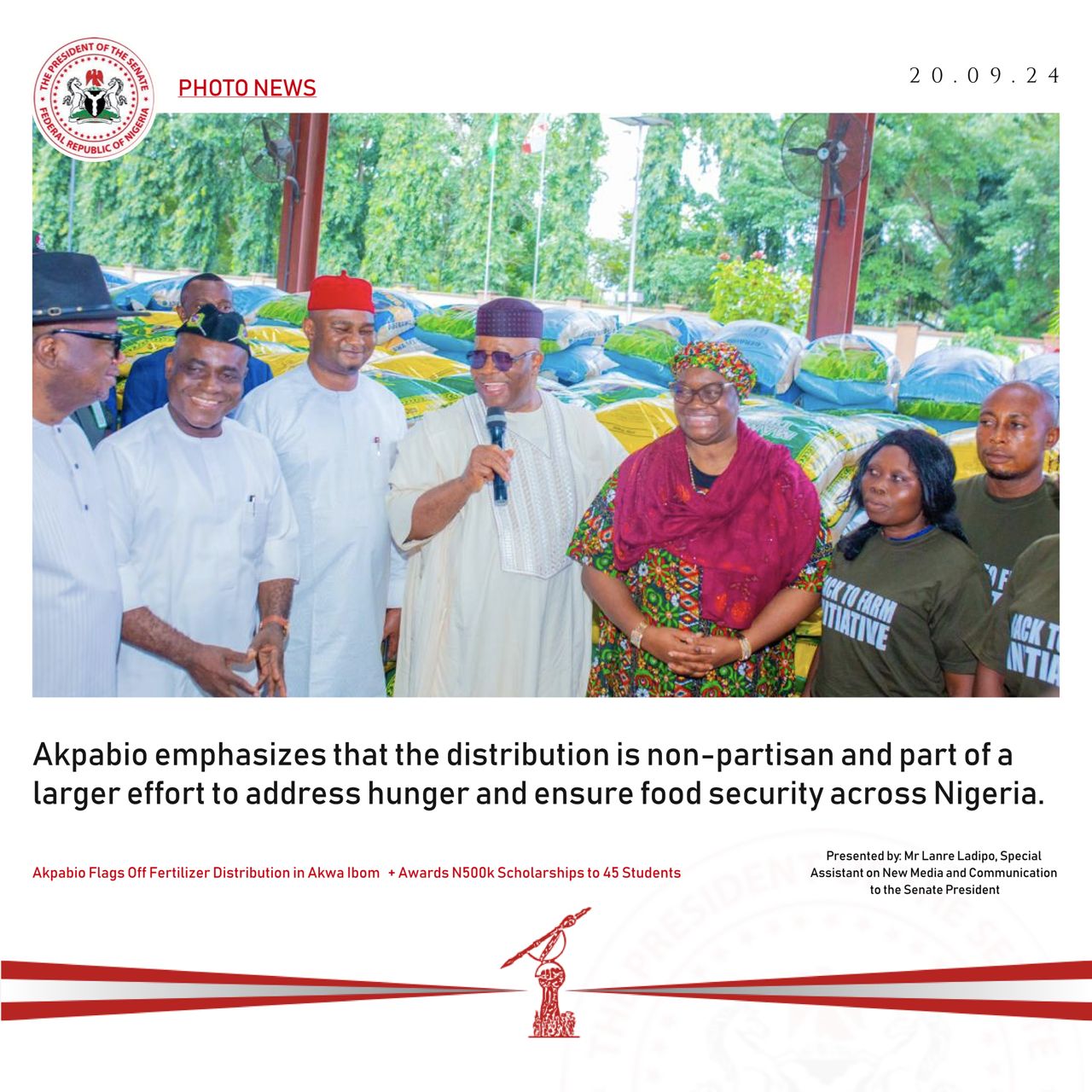 The President of the Senate, Godswill Akpabio, on Thursday, flagged-off the distribution of 16,800 bags of fertilizers to the people of Akwa Ibom State.